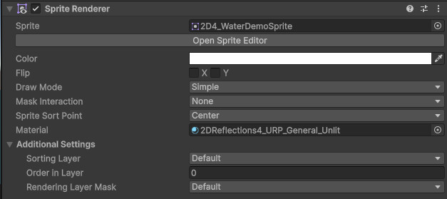 Then, we will create a new sprite object and assign a sprite to it. For this tutorial, we recommend adding the included 2D4_WaterDemoSprite as it has the pivot point placed already in the correct spot. We will also assign one of the reflective materials included with the asset, in this case, the 2DReflections4_URP_General_Unlit material